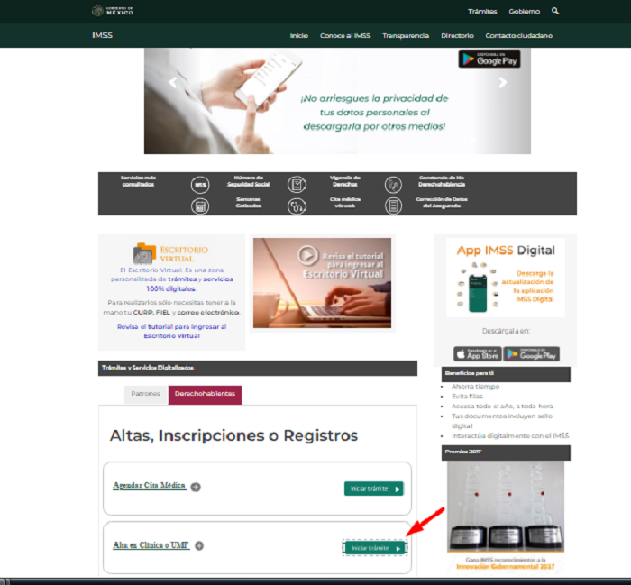 Baja la página y ubica la sección Alta en Clínica o UMF, haz clic en iniciar trámite que se indica con la flecha roja.